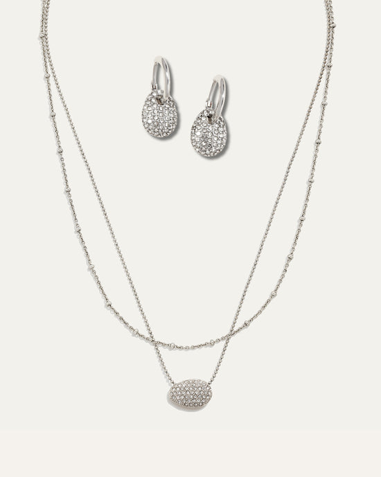 Elevate your everyday style with the Ulani layering necklace, a bestseller that effortlessly transitions from boardroom to brunch. This chic set features a delicate necklace paired with matching drop huggie earrings, both crafted with reversible design—flip between brilliant pave and polished shine depending on your mood. This versatile duo delivers understated elegance that works for every occasion. Pure sophistication, endlessly wearable.