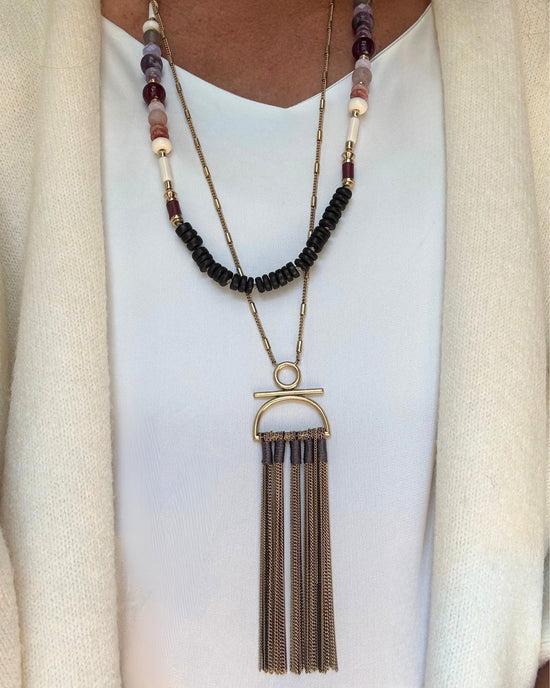 Meet the Mohave Tassel Necklace – a versatile statement piece that gives you three looks in one. Designed with richly hued beads, gold-dipped accents, and a dramatic vintage gold tassel pendant, each strand is fully detachable so you can wear them individually for a simple touch or layer them together for maximum impact. The mix of textures and colors makes this necklace easy to style with everything from a crisp white blouse to cozy knits, bringing bold movement and effortless versatility to your jewelry collection.