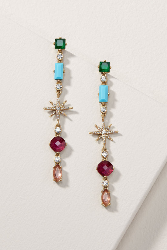 Playful color meets vintage-inspired sparkle with our Candy Jewels Linear Earrings. Featuring a cascading lineup of vibrant gemstones in emerald green, turquoise, fuchsia, and smoky plum, these earrings add an instant pop of color to any look. A shimmering starburst detail and sparkling crystals add a touch of whimsy and elegance. Length: 3.3"