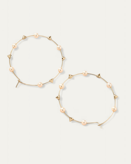 Elevate your accessory game with the Madison Pearl and Stud Statement Hoops. These striking 2.5" wire hoops blend edgy sophistication with refined elegance. The combination of lustrous glass pearl beads and bold gold studs creates a stunning contrast that makes a statement in any setting.