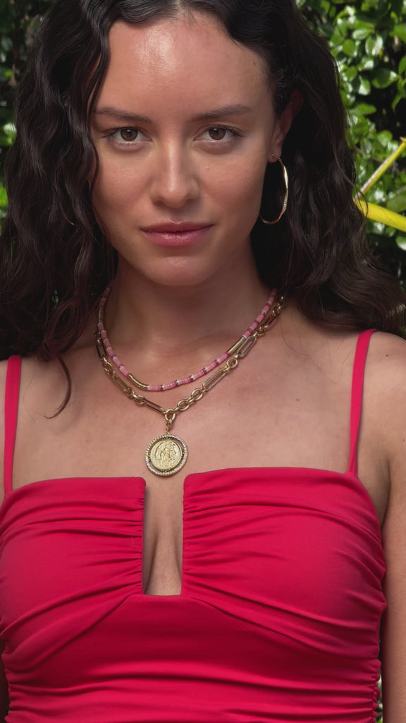 Elevate your everyday look with this statement-making Alex Gold Link Chain Necklace and Three Graces Medallion Charm Necklace. Featuring a bold, oversized link chain that captures the current trend with effortless sophistication, this piece is both modern and timeless.