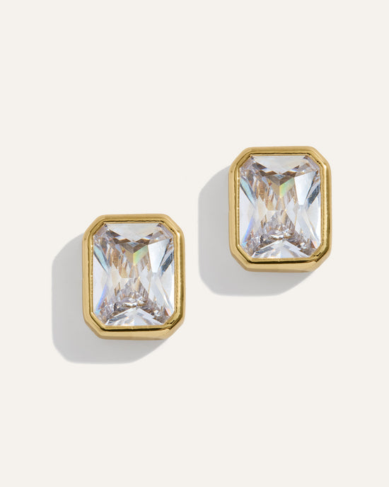 Timeless with a modern twist, these studs feature a striking emerald-cut simulated diamond framed in a sleek bezel setting. Crafted in 12 karat gold with hypoallergenic stainless steel posts, they offer both lasting shine and everyday comfort. This larger-scale version of our Bezel Set Essential Studs makes a slightly bolder statement while maintaining the same clean, modern lines that catch the light beautifully. Wear them solo for polished simplicity or pair them with other favorites in your ear stack.